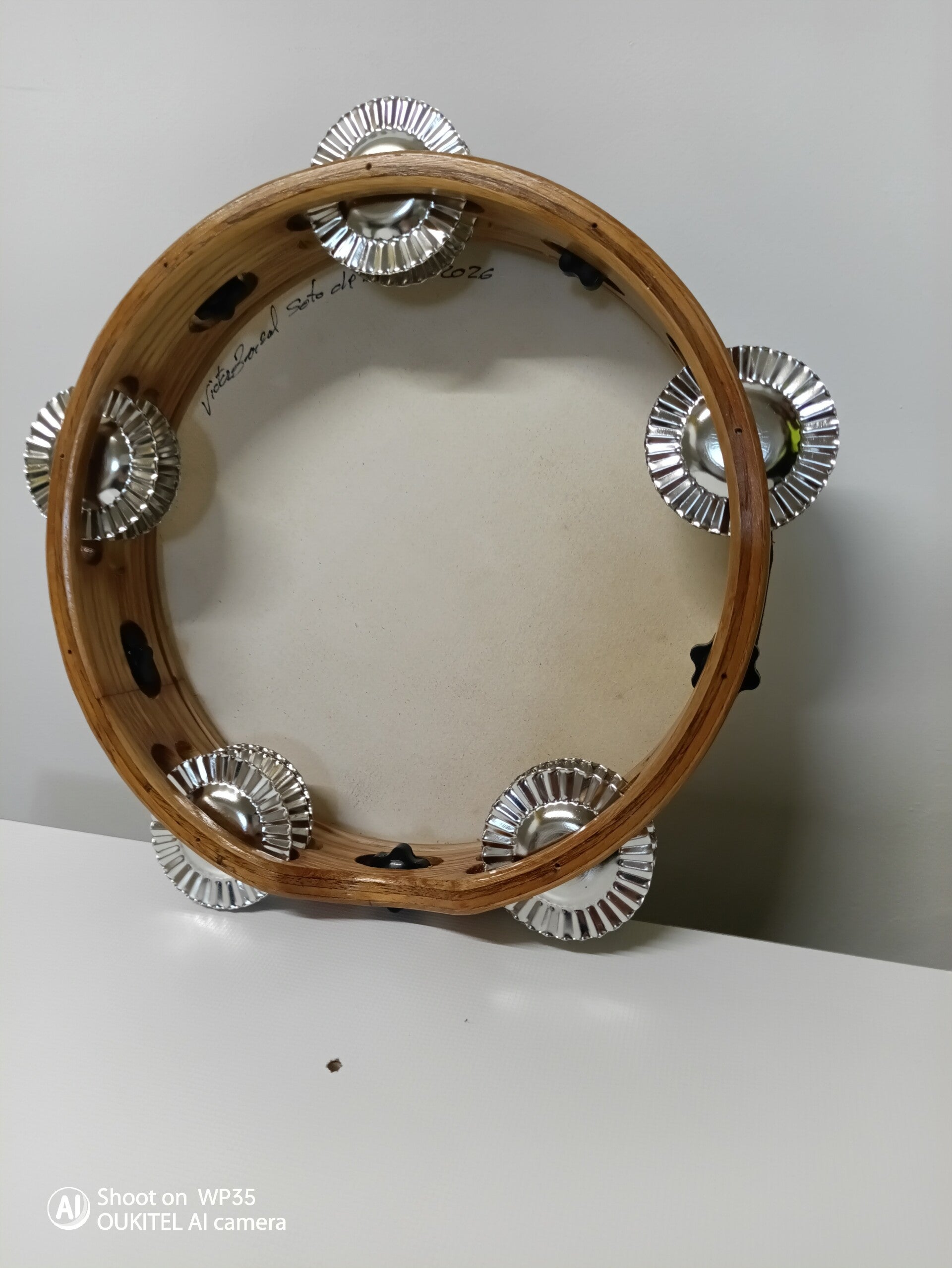 Pandereta gallega de 25 cm con sistema de tensado del parche con accionamiento sin llave, con 10 sonajas de hojalata colocadas en paralelo. Parche de piel natural clavado al marco. Acabado natural con aceite.